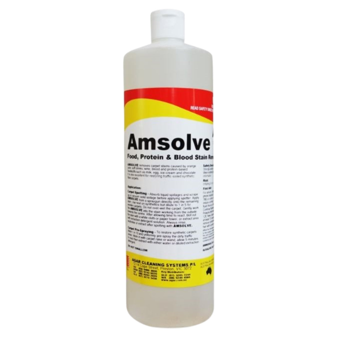 AGAR Amsolve 500ml What is Amsolve? AMSOLVE removes carpet stains caused by orange juice, soft drinks, wine, blood, and protein-based foodstuffs such as milk, egg, ice-cream and chocolate. It is also excellent for restoring traffic-soiled synthetic fibre carpets. Key Benefits Removes food and protein-based stains Brightens run-down synthetic carpets Biodegradable