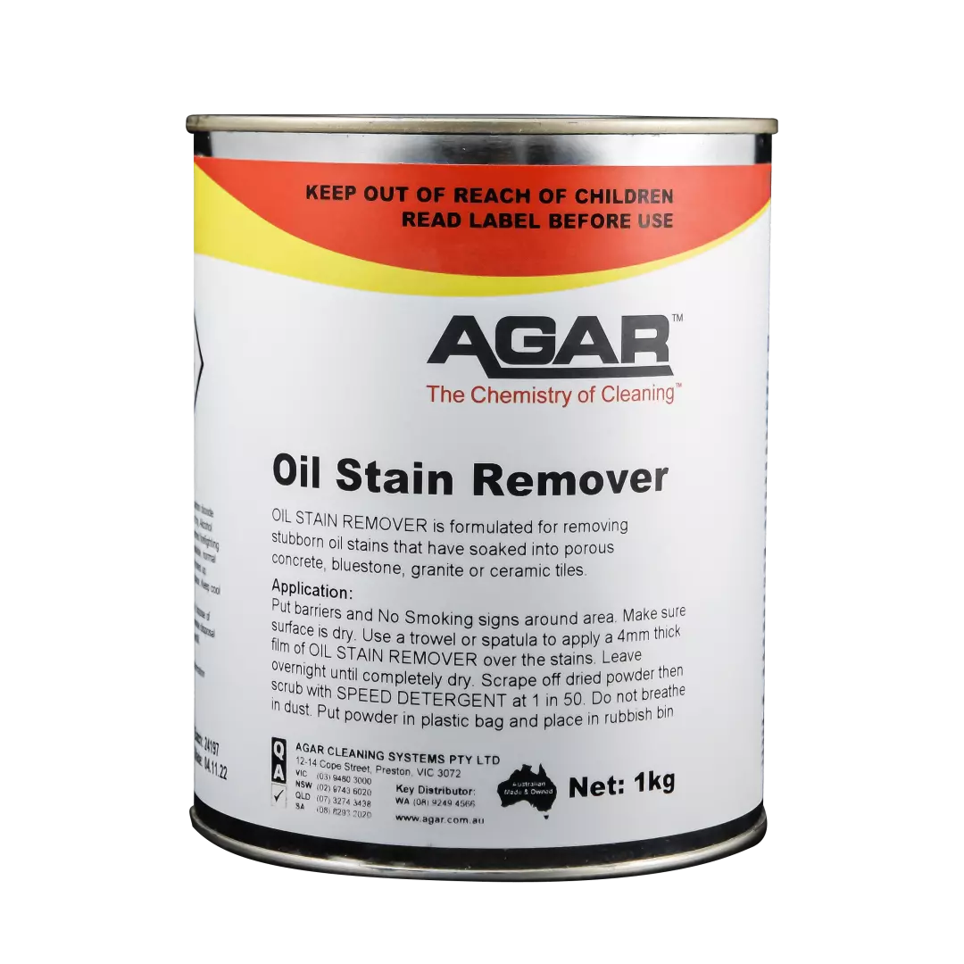 OIL STAIN REMOVER is a white absorbent paste containing mineral turpentine. It is to be used in the “poultice method” for removing stubborn oil stains that have soaked into porous concrete and stone floors and wall tiles.