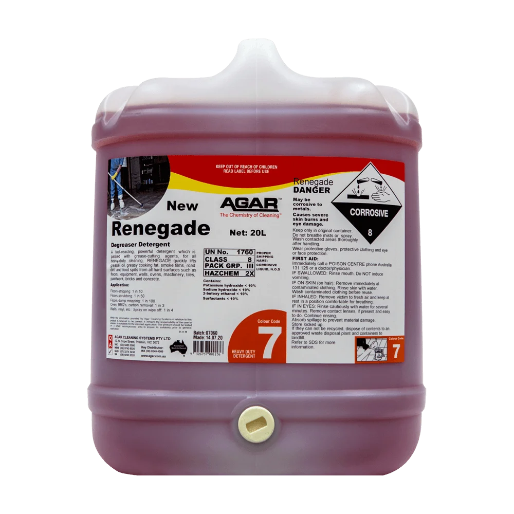 RENEGADE is a powerful degreaser and cleaner for removal of fat, dirt, oils and grease from hard surfaces. It is very versatile and is used to clean workshops, kitchens, buildings, infrastructure and factories. Key Benefits RENEGADE attacks dirt quickly and reduces the need for scrubbing RENEGADE has a thousand and one uses wherever you find dirt, oil and grease Low...