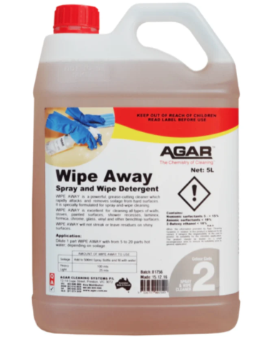 WIPE AWAY is a fast-working cleaner that easily attacks and removes soilage from hard surfaces. It is designed to wipe off in one pass with no residues or ‘films’ being left on the surface. The popular sweet spice perfume leaves the area with a delightful fragrance in the air.