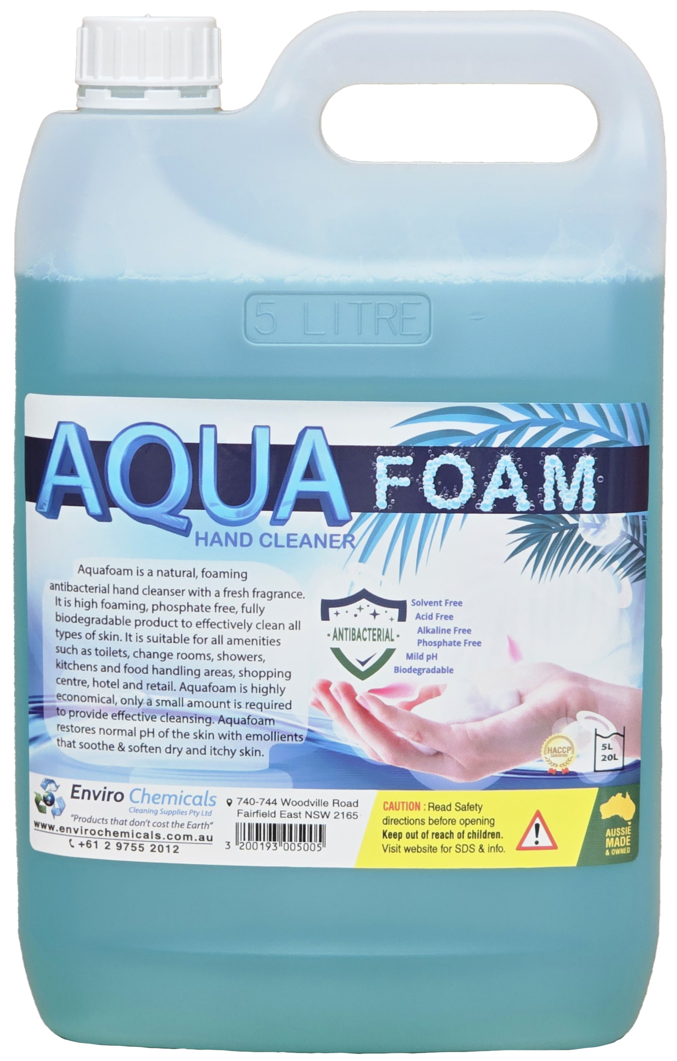 AQUA FOAM is a natural, soap free hand cleanser. AQUA FOAM is a thick, gently perfumed, high foaming, phosphate free, fully biodegradable product to clean all type of hands and skin. AQUA FOAM is design for public and office washrooms, kitchen, laundries and domestic bathrooms. AQUA FOAM uses natural ingredients, soap free cleanser which restores normal pH of the skin with emollients that soothe and soften dry and itchy skin. AQUA FOAM is an AQIS approved formula (Australian Quarantine and Inspection Services) AQUA FOAM is made from the highest of quality and highly biodegradable materials, using the highest grade of materials gives Enviro Chemicals two advantage points. We have a superior quality product and We have a safe product that is safe on the environment, safe for you and your loved ones especially if you or some one in your family have sensitive skin. AQUAFOAM is safe to be used in conjunction with a septic system.