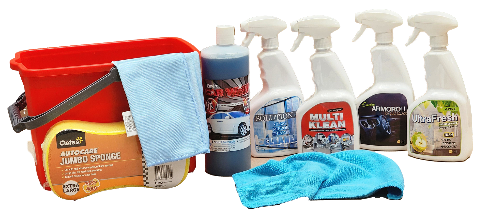 Car Care Kit. Kit includes: 1 x 1Ltr Car Wash & Wax 1 x 750ml Super Armorall 1 x 750ml Multiklean (Degreaser & Mag wheel Cleaner) 1 x 750ml Solution (Glass Cleaner) 1 x 750ml Ultrafresh Apple (Deodoriser / Disinfectant) 1 x Bucket All Purpose Rectangular 9L Blue 1 x Jumbo Sponge- Dogbone 1 x Microfibre cloth 1 x Microfibre...