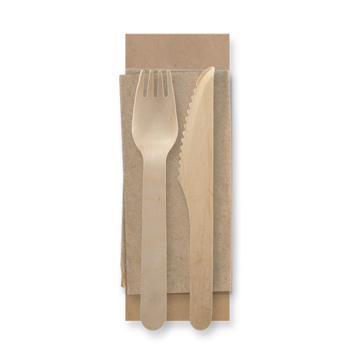 Pre-packed wooden cutlery set fork/knife/napkin, great for takeaway.