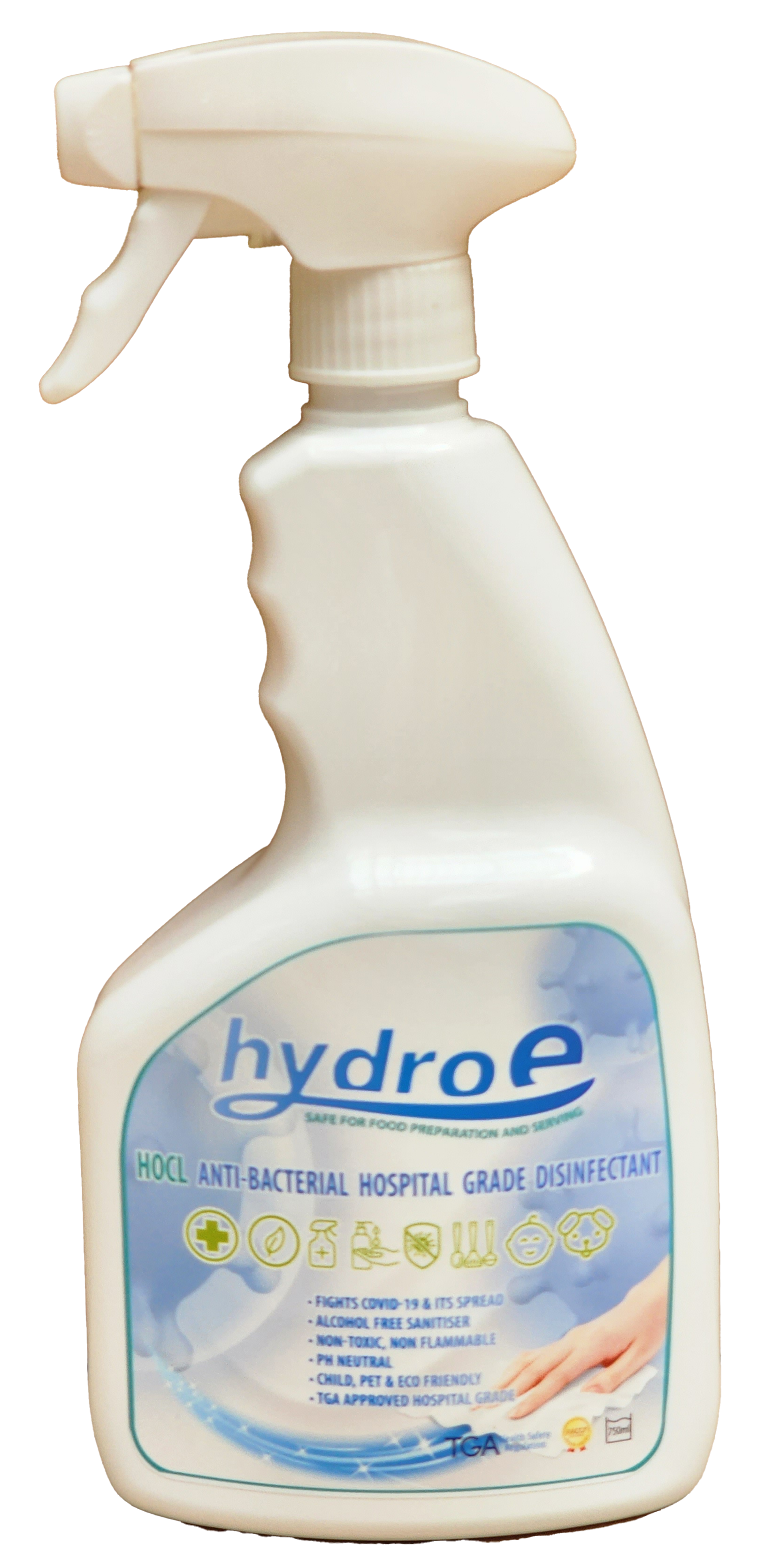 Hydro-E is an effective and powerful Hospital Grade Disinfectant that is formulated using HOCl (Hypochlorous Acid) and designed to provide a safe and non-toxic solution for cleaning and disinfecting a wide range of surfaces, such as hospital, healthcare facilities, and as a Hand sanitiser