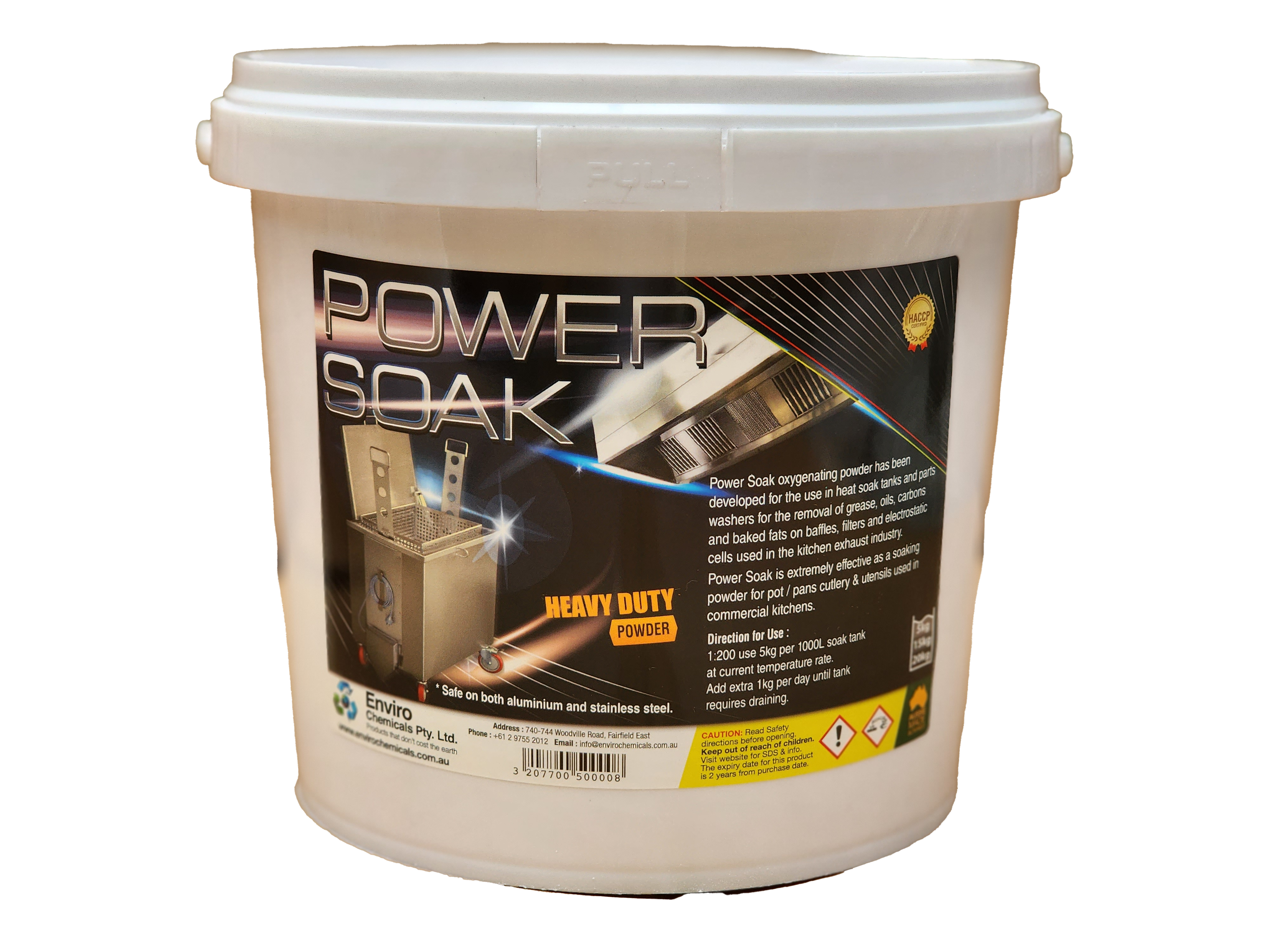 POWER SOAK is a revolutionary designed, concentrated and bio-degradable soaking powder. POWER SOAK developed for the use in heat soak tanks and parts washers. POWER SOAK will remove grease, oils, carbons and baked fats on baffles, filters and electrostatic cells used in kitchen exhaust industry. POWER SOAK is extremely effective as a soaking powder for pot / pans cutlery & utensils used in commercial kitchens.