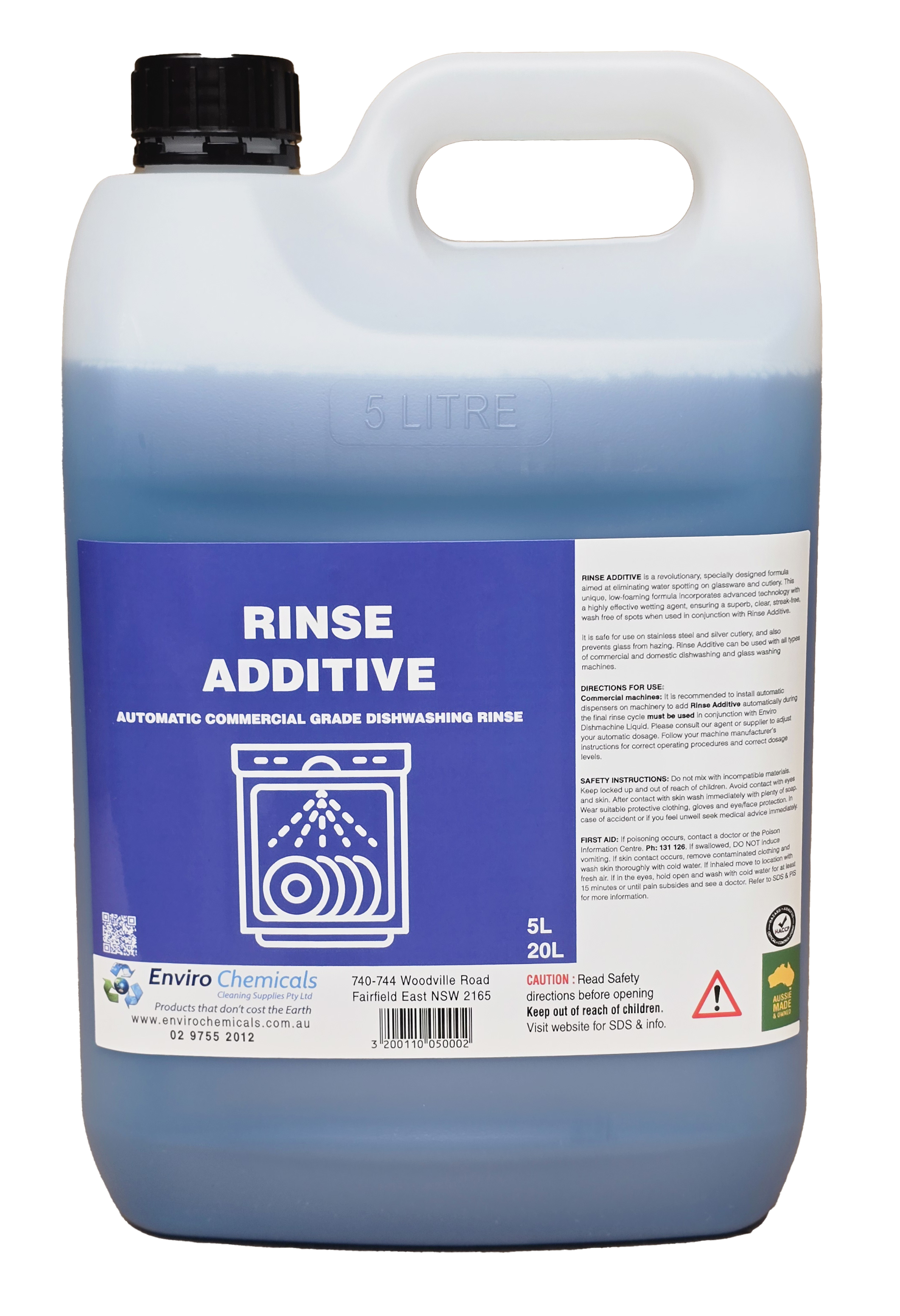 ENVIRO RINSE AID is a revolutionary designed special formula to eliminate water spotting on glassware and cutlery. ENVIRO RINSE AID’s unique low foaming new tech formula contains a very effective wetting agent.