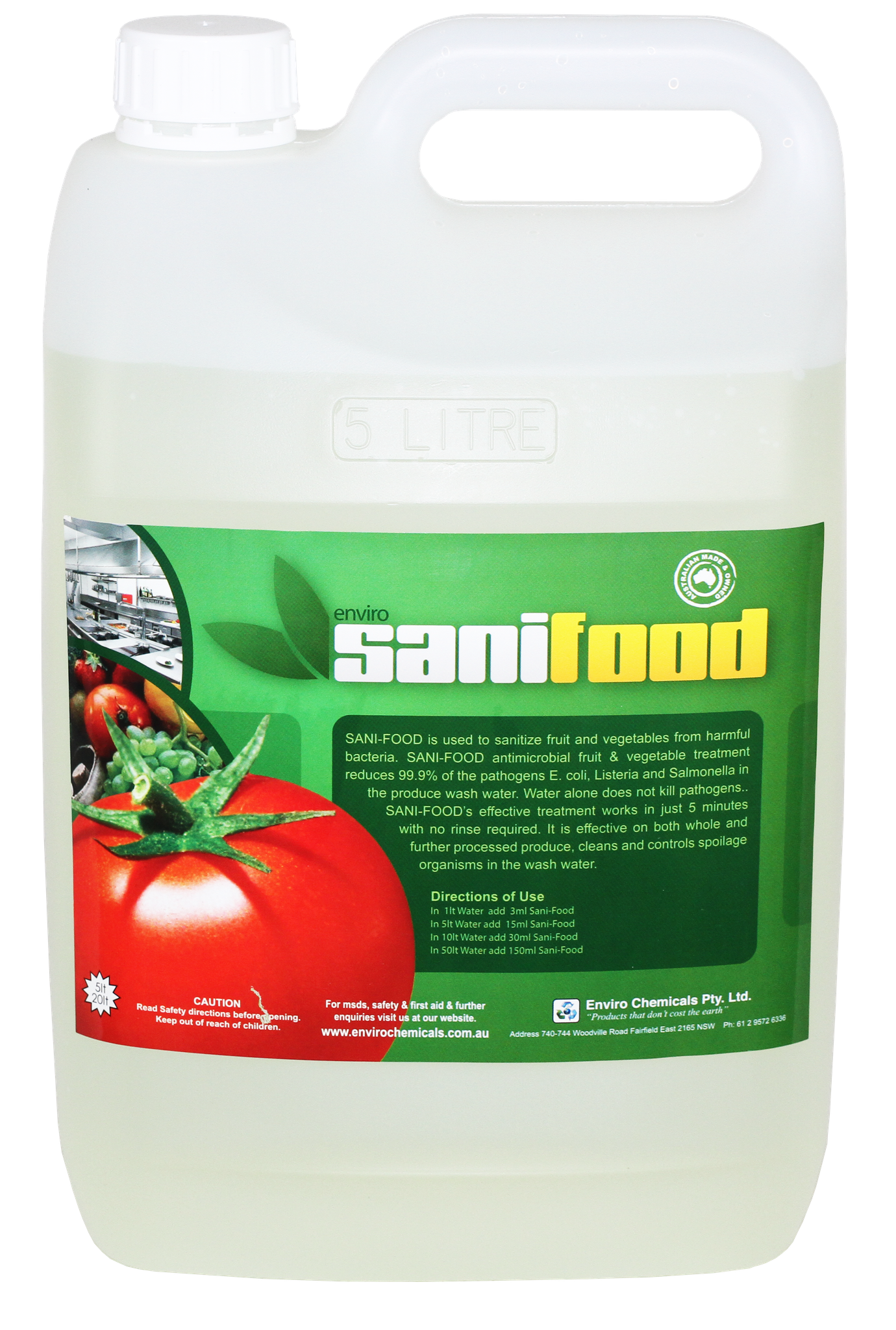 Raw fruit and vegetables may be contaminated with microorganisms, including pathogenic E.coli, Salmonella and Listeria monocytogenes. Washing raw produce with SANI-FOOD has been shown to reduce the number of microorganisms. If facilities prepare their own salads, it is recommended that washing and sanitising salad vegetables is an important part of an overall strategy to reduce the risk of microorganisms. It is recommended that all fruit and vegetables be washed in clean water then sanitised by soaking 100ppm SANI-FOOD for 5 minutes.