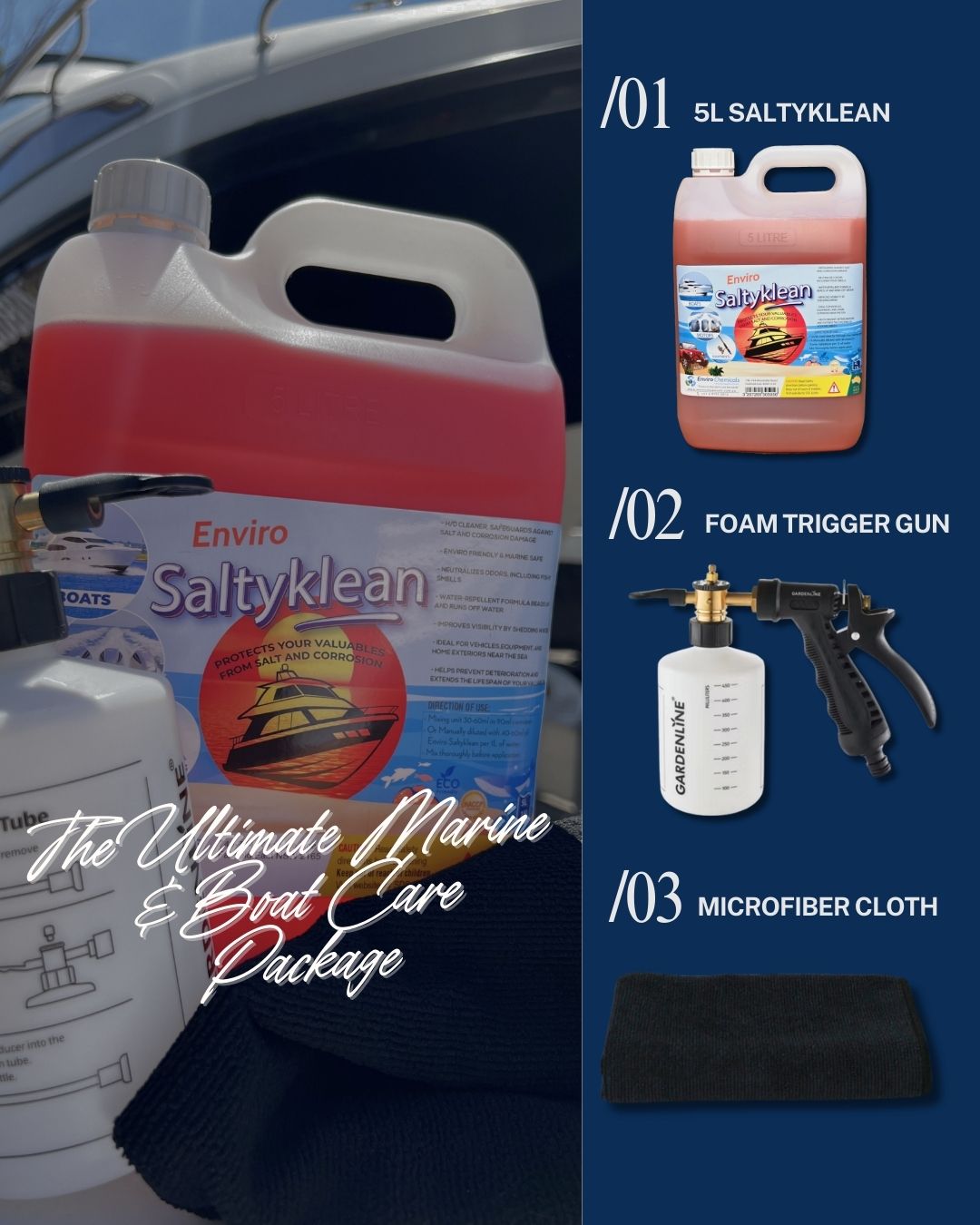 Salt residue, cloudy windows and fishy odours are all part of life on the water and that’s not exactly desirable. That’s where our Ultimate Marine and Boat Care Package comes in.